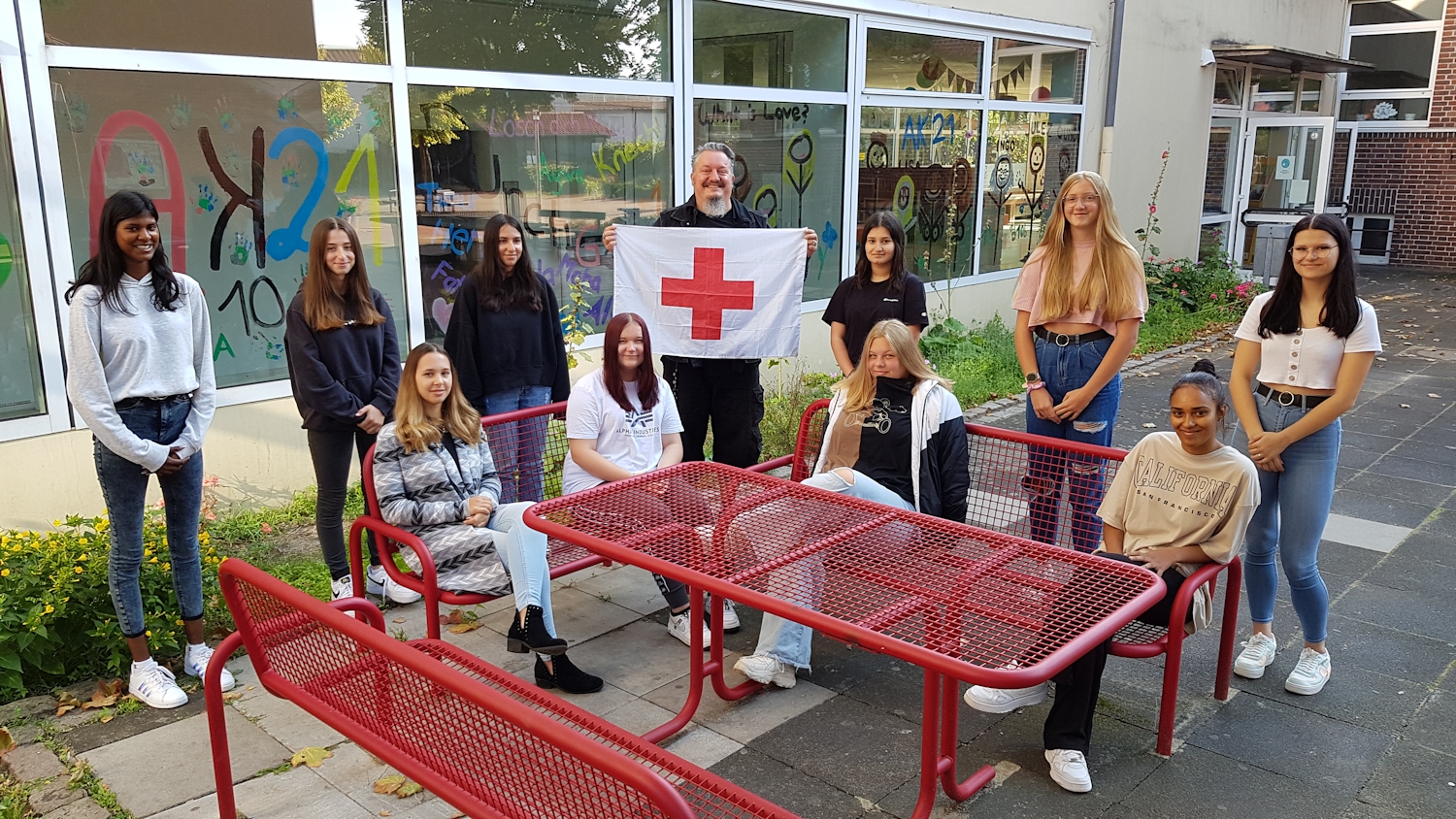 Die Schülerinnen und Schüler haben eine Ausbildung zum Sanitäter (Ersthelfer) abgeschlossen. Anschließend wurde in Absprache mit der Schulleitung und Herrn Korte vom DRK der Schulsanitätsdienst ins Leben gerufen. |